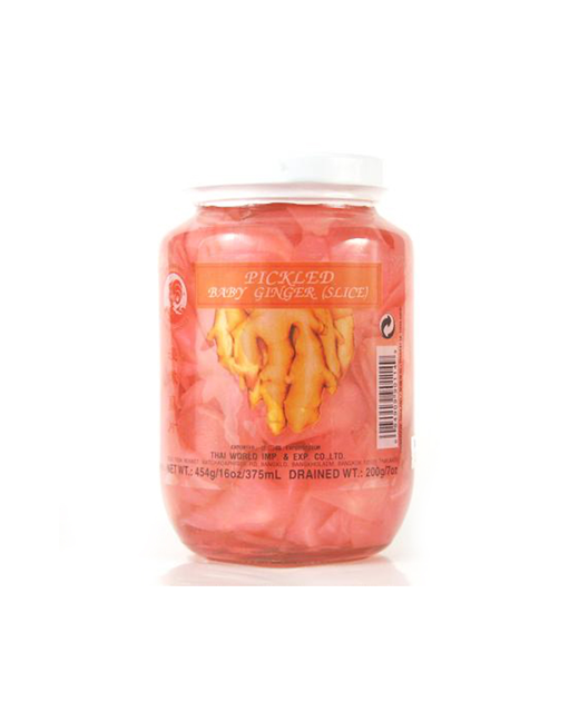 • Ingredients: baby ginger, water, vinegar, salt, sodium benzoate, sugar, food colouring (129)