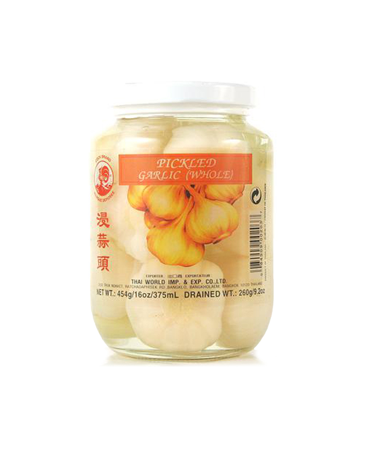 Pickled Whole Garlic Bulbs in brine. Product of Thailand.Ingredients:Garlic (57%)Water (16%)Sugar (15%)VinegarSaltSodium benzoate (E211)