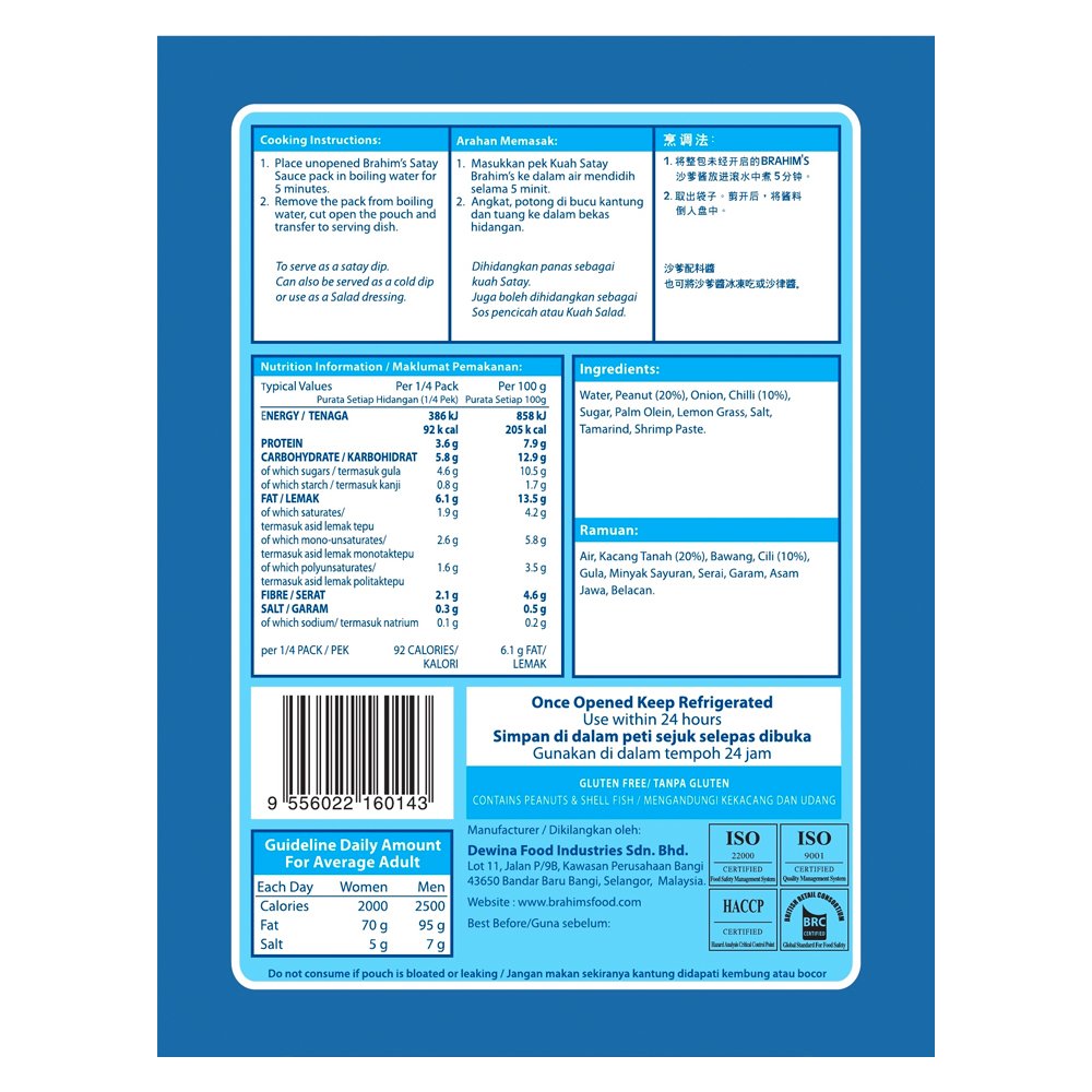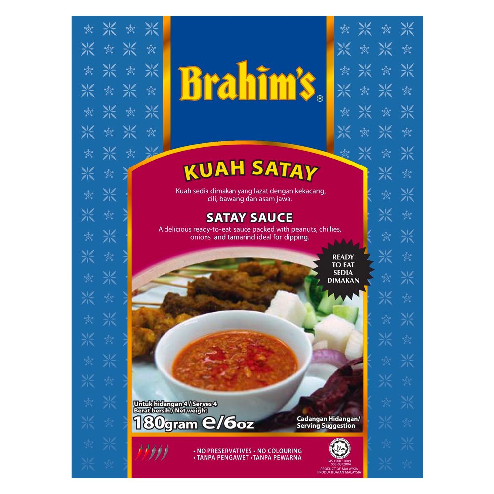 Directions:1) Place unopened Brahim's Statay Sauce pack in boiling water for 5 minutes. 2) Remove the pack from boiling water, cut open the pouch and transfer to serving dish to serve as satay dip.Ingredients:WaterPeanut OnionChilliSugarPalm OleinLemon grassSaltTamarindShrimp paste